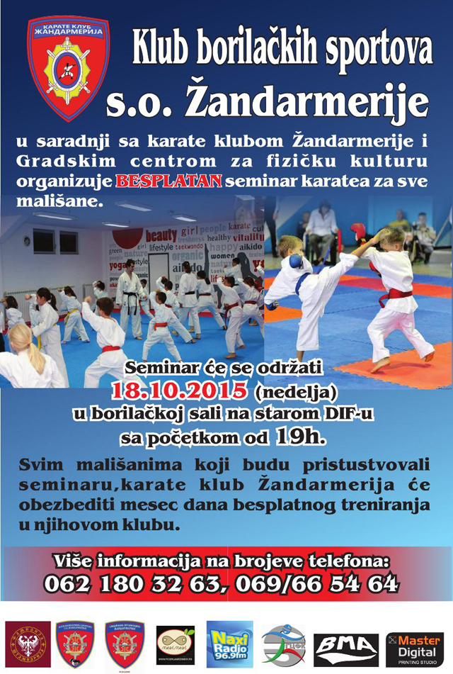 Karate klub Žandarmerija će u saradnji sa Klubom borilačkih sportova s.o. Žandarmerije i Gradskim centrom za fizičku kulturu organizovati otvoreni trening (seminar) kojem će moći da prisustvuju svi mališani.