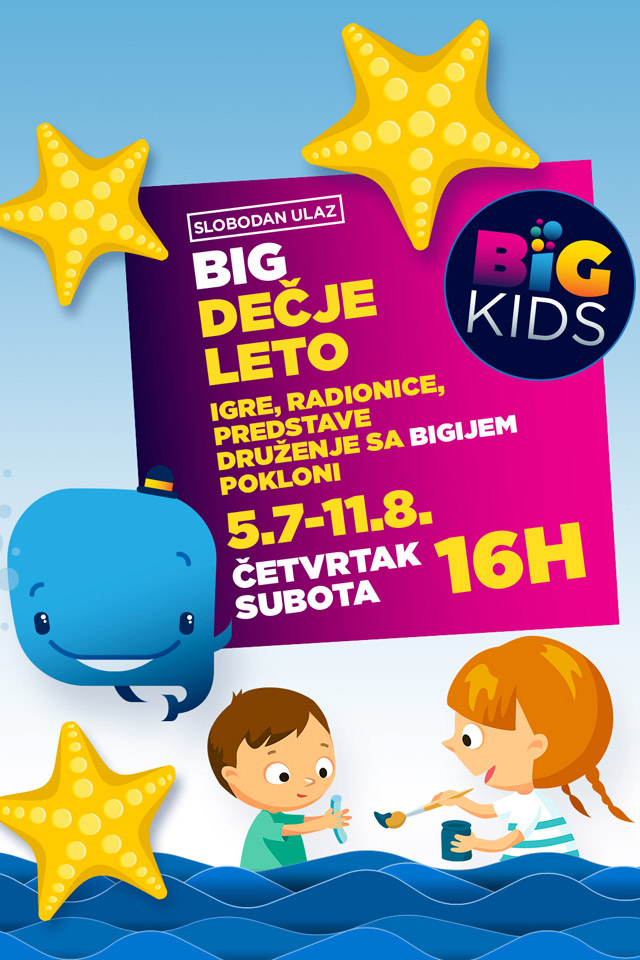 Matematičke, sportske i muzičke igrice, crtanje i bojenje različitim tehnikama, predstave, mađioničarski trikovi i još mnogo toga zanimljivog samo su deo besplatne manifestacije BIG dečije leto koja je otvorena u atrijumu BIG FASHION centra i trajaće svakog četvrtka i subote, od 5. jula do 11. avgusta, od 16 do 20 časova.