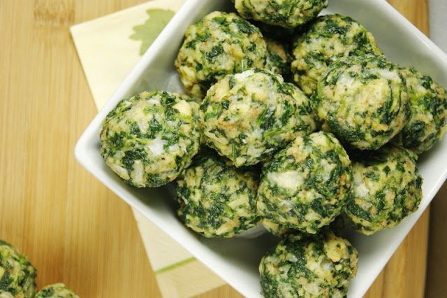 Priprema: sve sastojke, zajedno sa prethodno pripremljenom poparom, dobro izmešajte i oblikujte loptice prečnika, približno, 2,5 cm. Poređajte ih na nauljen papir za pečenje i pecite 20-ak minuta u rerni zagrejanoj na 180 stepeni . ( Trebalo bi dobijete 60-akkuglica od spanaća )