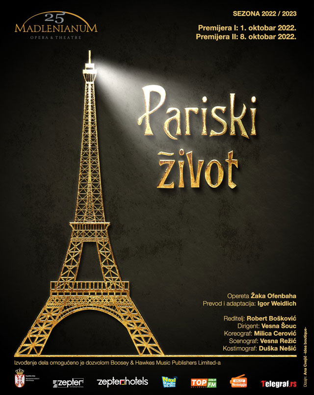 Opereta se vraća na velika vrata u Beograd, tačnije Zemun. Nakon značajnog uspeha predstave Vesela udovica 2020. godine, postavljamo još jednu operetu, ovog puta nemačko-francuskog autora Žaka Ofenbaha Pariski život. Zabavnog sadržaja, punog preokreta, brze radnje, sa pregršt muzičkih i koreografisanih numera Madlenianum se vraća ovom žanru, koji je nepravedno skrajnut sa naših scena, a podjednako kao mjuzikl, donosi radost širokoj publici. Opereta Pariski život svetski je uspeh velikog kompozitora Žaka Ofenbaha (Jacques Offenbach), koja je premijeru doživela 1866. u Parizu. Libreto su tada napisali Anri Mejak (Henri Meilhac) i Ludovic Halévy (Lidovik Alevi). Pariski život u Beogradu je postavila dokazana autorska ekipa na čelu sa rediteljem Robertom Boškovićem i njegovim stalnim saradnicima iz Hrvatske: Igorom Vajdlihom (Igor Weidlich) kao dramaturgom koji je radio i prepev stihova i adaptaciju, scenografom Vesnom Režić, kostimografom Duškom Nešić i Draženom Matijaševićem koji je radio lutke. Na čelu beogradske ekipe za dirigentskim pultom je Vesna Šouc, a složenu i nadasve zabavnu koreografiju je radila Milica Cerović, dizajn svetla Srđan Jovanović i dizajn zvuka Dušan Arsikin.